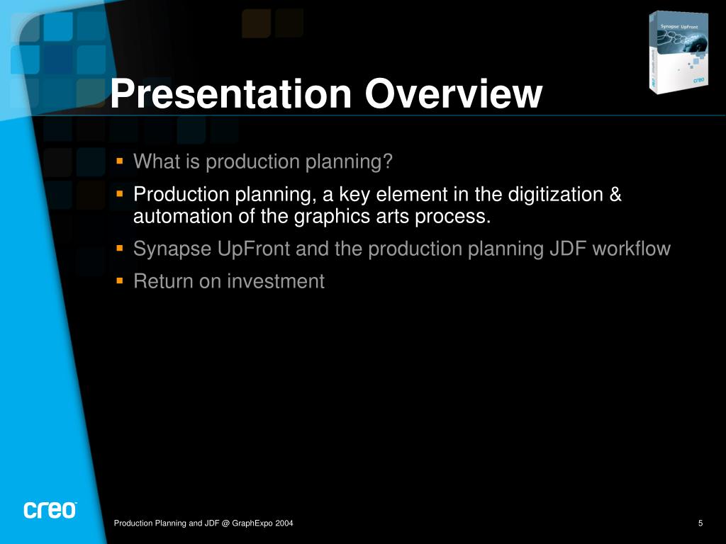 Presentation Overview • What is production planning? • Production planning, a key element in the digitization & automation of the graphics arts process. • Synapse UpFront and the production planning JDF workflow • Return on investment Production Planning and JDF @ GraphExpo 2004