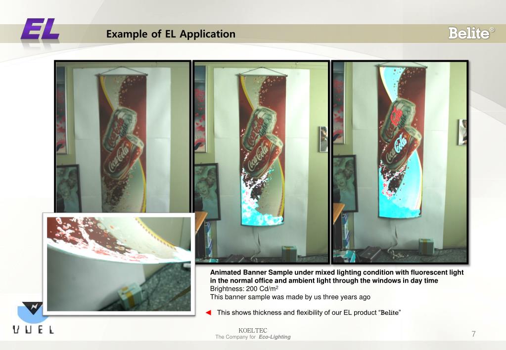 Example of EL Application AnimatedBanner Sample under mixed lighting condition with fluorescent light in the normal office and ambient light through the windows in day time Brightness: 200 Cd/m2 This banner sample was made by us three years ago This shows thickness and flexibility of our EL product “Belite” KOELTEC The Company for Eco-Lighting
