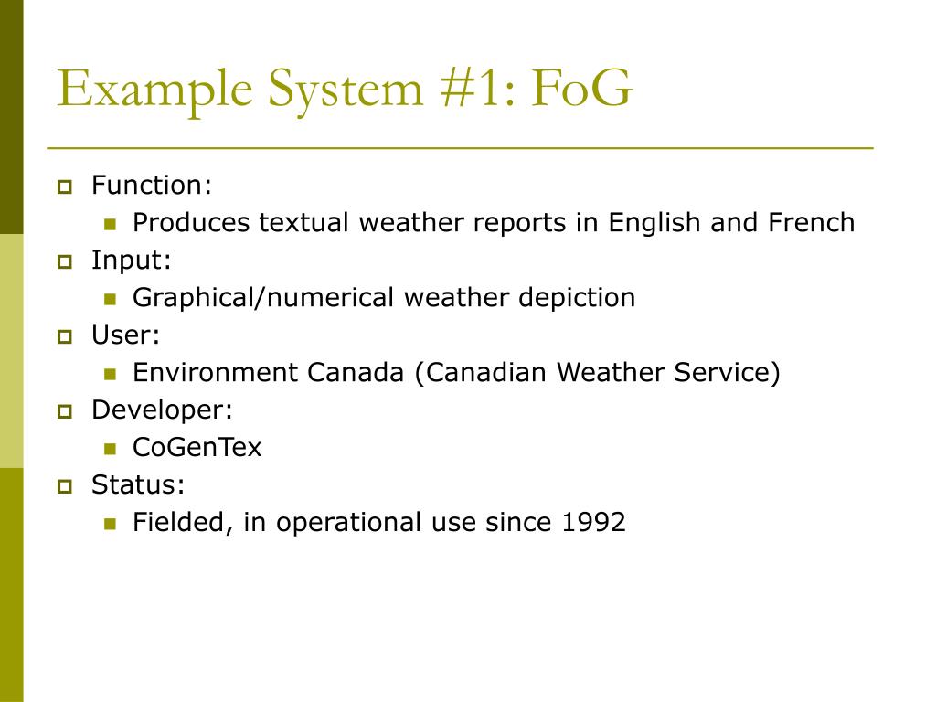 Example System #1: FoG • Function: • Produces textual weather reports in English and French • Input: • Graphical/numerical weather depiction • User: • Environment Canada (Canadian Weather Service) • Developer: • CoGenTex • Status: • Fielded, in operational use since 1992
