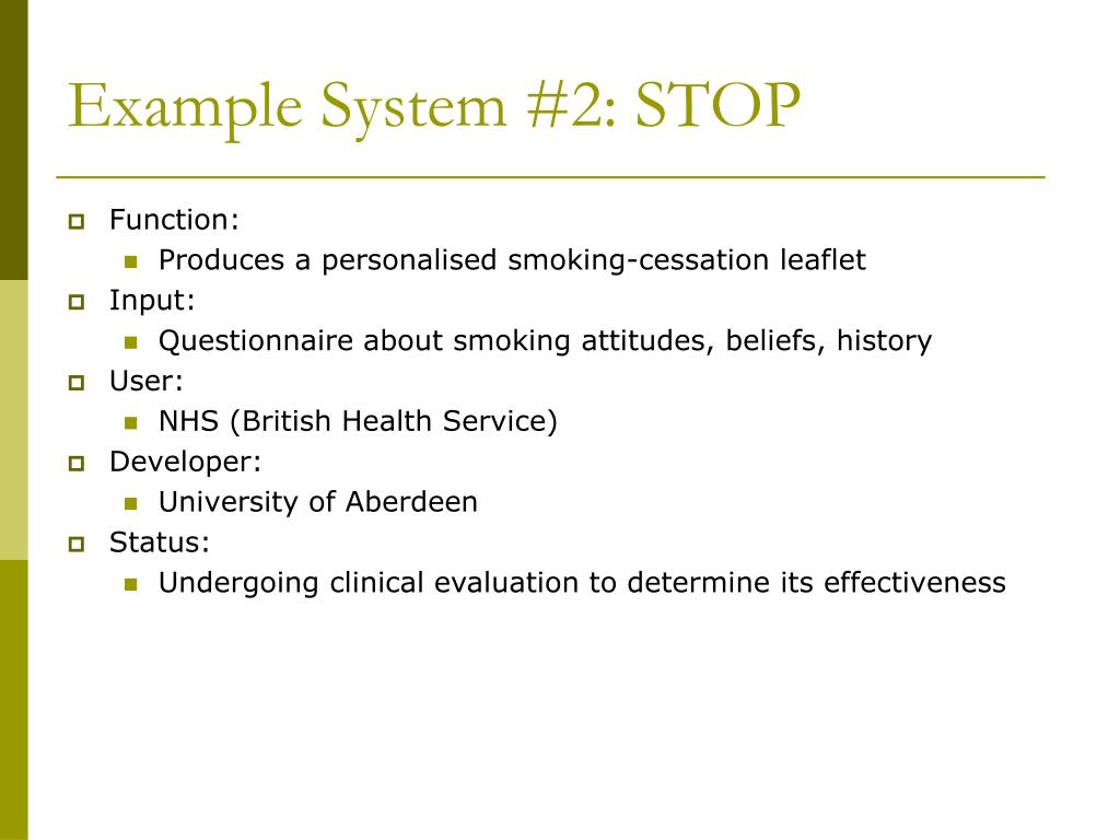 Example System #2: STOP • Function: • Produces a personalised smoking-cessation leaflet • Input: • Questionnaire about smoking attitudes, beliefs, history • User: • NHS (British Health Service) • Developer: • University of Aberdeen • Status: • Undergoing clinical evaluation to determine its effectiveness