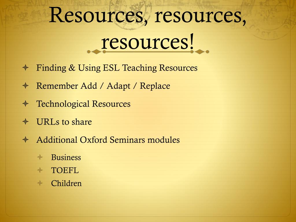 Resources, resources, resources! • Finding & Using ESL Teaching Resources • Remember Add / Adapt / Replace • Technological Resources • URLs to share • Additional Oxford Seminars modules • Business • TOEFL • Children