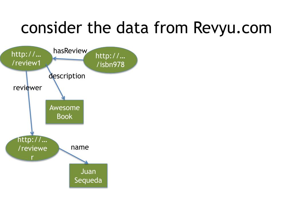 consider the data from Revyu.com hasReview http://…/review1 http://…/isbn978 description reviewer Awesome Book http://…/reviewer name Juan Sequeda