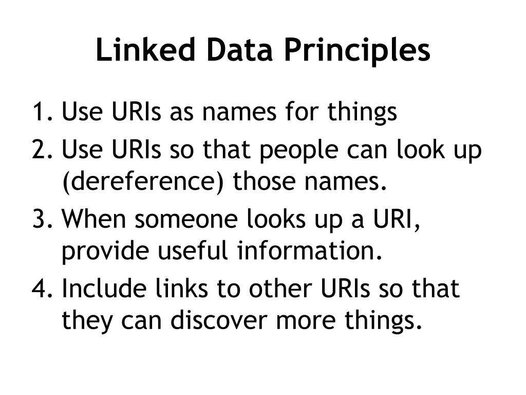Linked Data Principles • Use URIs as names for things • Use URIs so that people can look up (dereference) those names. • When someone looks up a URI, provide useful information. • Include links to other URIs so that they can discover more things.