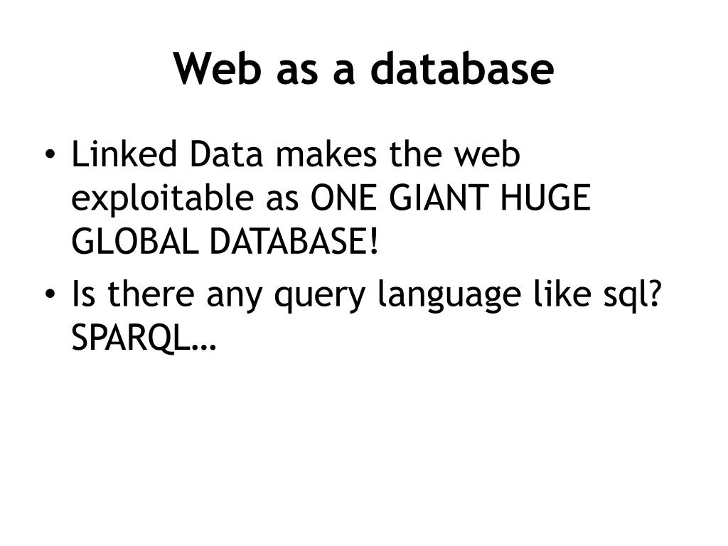 Web as a database • Linked Data makes the web exploitable as ONE GIANT HUGE GLOBAL DATABASE! • Is there any query language like sql?SPARQL…