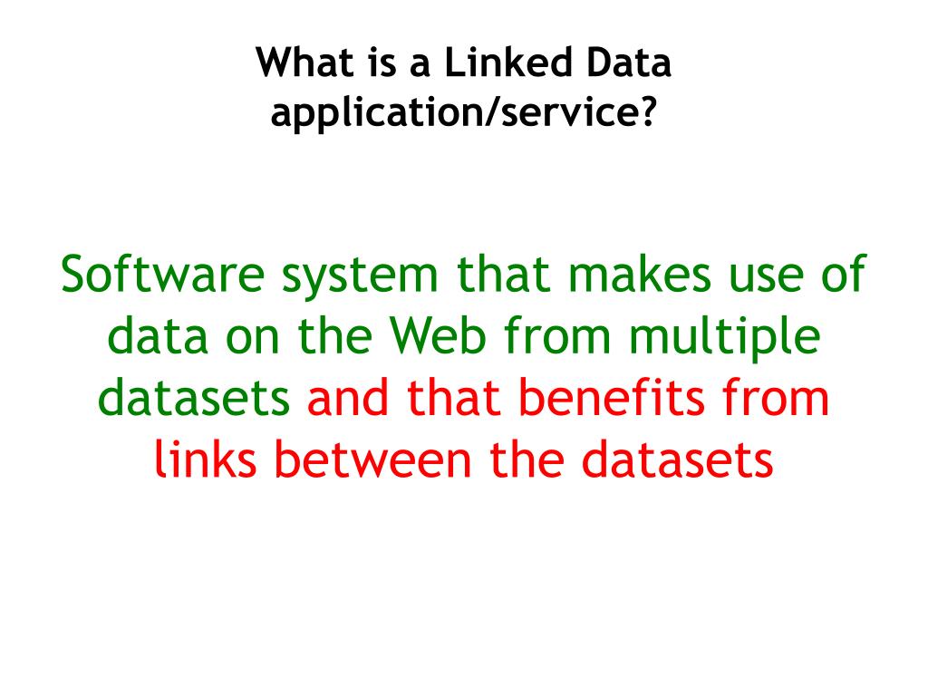 What is a Linked Data application/service? Software system that makes use of data on the Web from multiple datasets and that benefits from links between the datasets
