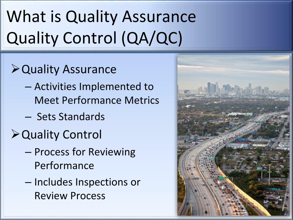 What is Quality Assurance Quality Control (QA/QC) • Quality Assurance • Activities Implemented to Meet Performance Metrics • Sets Standards • Quality Control • Process for Reviewing Performance • Includes Inspections or Review Process