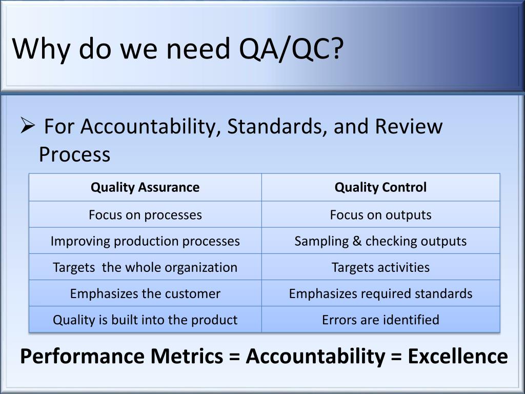 Why do we need QA/QC? • For Accountability, Standards, and Review Process Performance Metrics = Accountability = Excellence