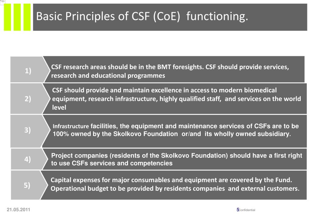 Basic Principles of CSF (CoE) functioning. CSF research areas should be in the BMT foresights. CSF should provide services, research and educational programmes 1) 2) CSF should provide and maintain excellence in access to modern biomedical equipment, research infrastructure, highly qualified staff, and services on the world level 3) Infrastructure facilities, the equipment and maintenance services of CSFs are to be 100% owned by the Skolkovo Foundation or/and its wholly owned subsidiary. 4) Project companies (residents of the Skolkovo Foundation) should have a first right to use CSFs services and competencies Capital expenses for major consumables and equipment are covered by the Fund. Operational budget to be provided by residents companies and external customers. 5) Confidential