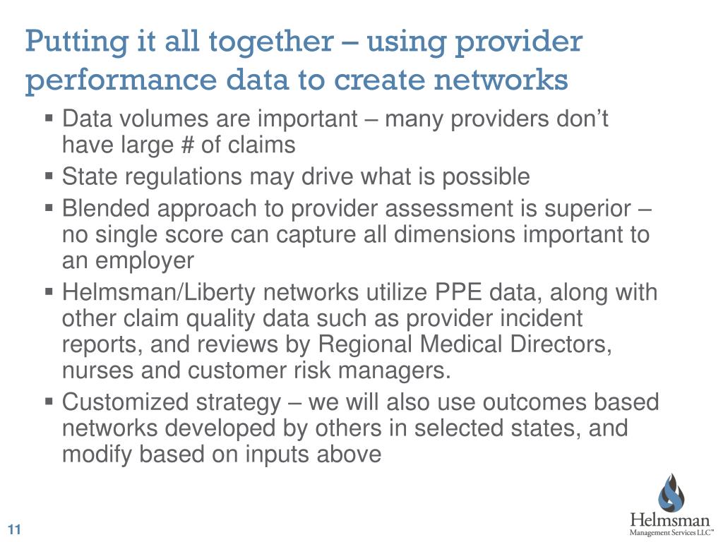 Putting it all together – using provider performance data to create networks • Data volumes are important – many providers don’t have large # of claims • State regulations may drive what is possible • Blended approach to provider assessment is superior – no single score can capture all dimensions important to an employer • Helmsman/Liberty networks utilize PPE data, along with other claim quality data such as provider incident reports, and reviews by Regional Medical Directors, nurses and customer risk managers. • Customized strategy – we will also use outcomes based networks developed by others in selected states, and modify based on inputs above