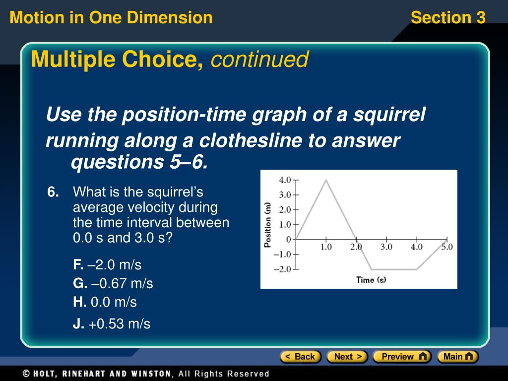 Multiple Choice, continued Use the position-time graph of a squirrel running along a clothesline to answer questions 5–6. 6. What is the squirrel’s average velocity during the time interval between 0.0 s and 3.0 s? F. –2.0 m/s G. –0.67 m/s H. 0.0 m/s J. +0.53 m/s