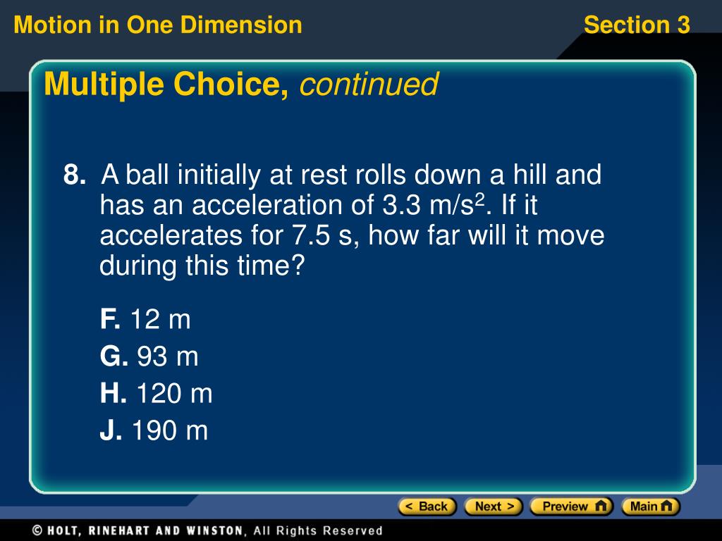 Multiple Choice, continued • 8. A ball initially at rest rolls down a hill and has an acceleration of 3.3 m/s2. If it accelerates for 7.5 s, how far will it move during this time? • F. 12 m • G. 93 m • H. 120 m • J. 190 m