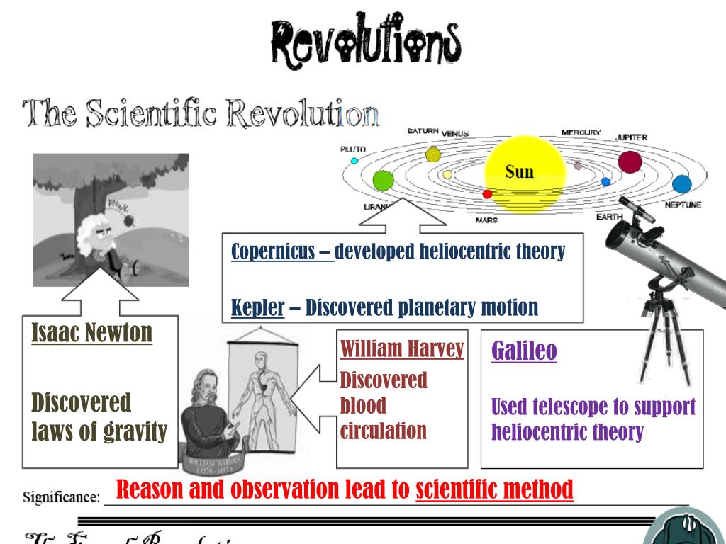 Copernicus – developed heliocentric theory Kepler – Discovered planetary motion Isaac Newton Discovered laws of gravity William Harvey Discovered blood circulation Galileo Used telescope to support heliocentric theory Reason and observation lead to scientific method