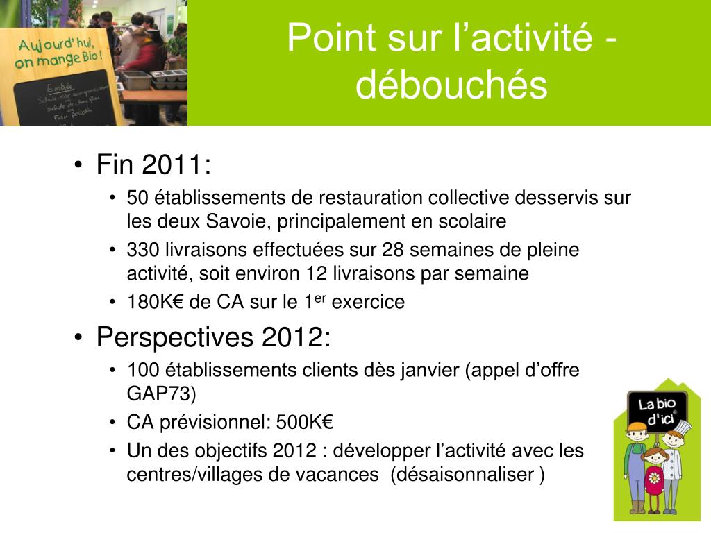 Point sur l’activité - débouchés • Fin 2011: • 50 établissements de restauration collective desservis sur les deux Savoie, principalement en scolaire • 330 livraisons effectuées sur 28 semaines de pleine activité, soit environ 12 livraisons par semaine • 180K€ de CA sur le 1er exercice • Perspectives 2012: • 100 établissements clients dès janvier (appel d’offre GAP73) • CA prévisionnel: 500K€ • Un des objectifs 2012 : développer l’activité avec les centres/villages de vacances (désaisonnaliser )