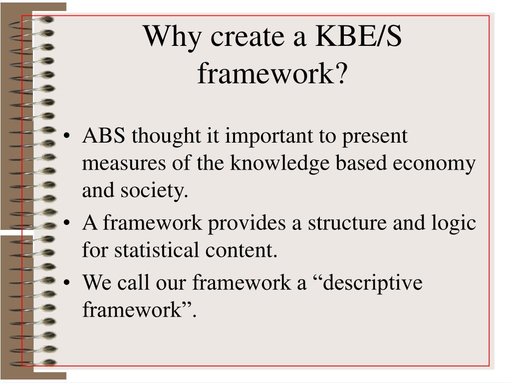 Why create a KBE/S framework? • ABS thought it important to present measures of the knowledge based economy and society. • A framework provides a structure and logic for statistical content. • We call our framework a “descriptive framework”.