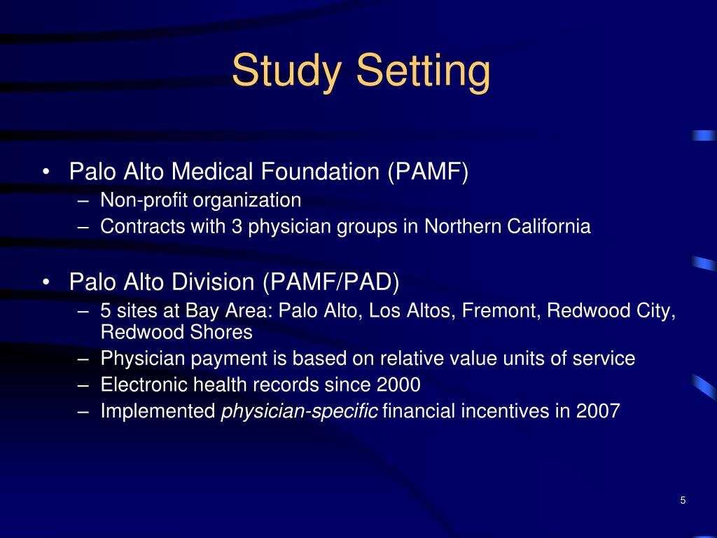 Study Setting • Palo Alto Medical Foundation (PAMF) • Non-profit organization • Contracts with 3 physician groups in Northern California • Palo Alto Division (PAMF/PAD) • 5 sites at Bay Area: Palo Alto, Los Altos, Fremont, Redwood City, Redwood Shores • Physician payment is based on relative value units of service • Electronic health records since 2000 • Implemented physician-specific financial incentives in 2007