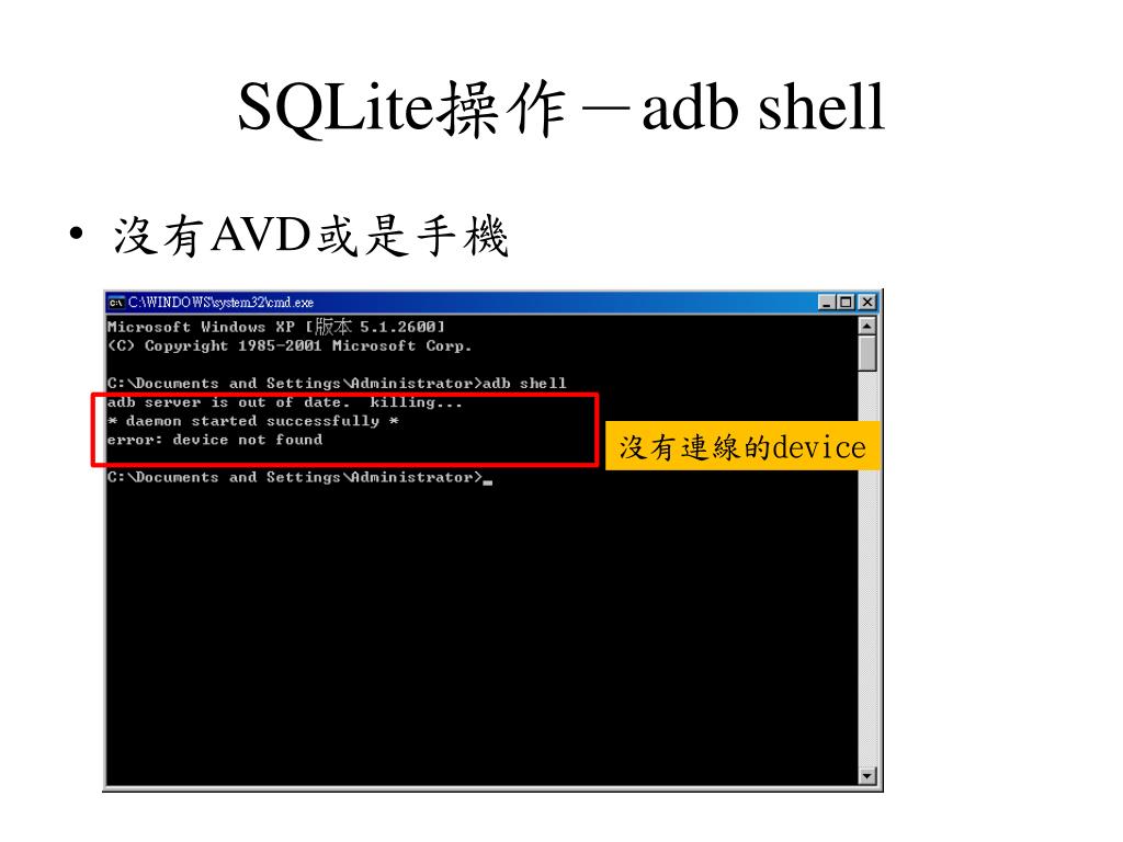 SQLite操作-adb shell • 沒有AVD或是手機 沒有連線的device
