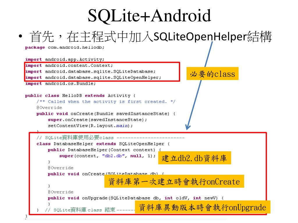 SQLite+Android • 首先,在主程式中加入SQLiteOpenHelper結構 必要的class 建立db2.db資料庫 資料庫第一次建立時會執行onCreate 資料庫異動版本時會執行onUpgrade