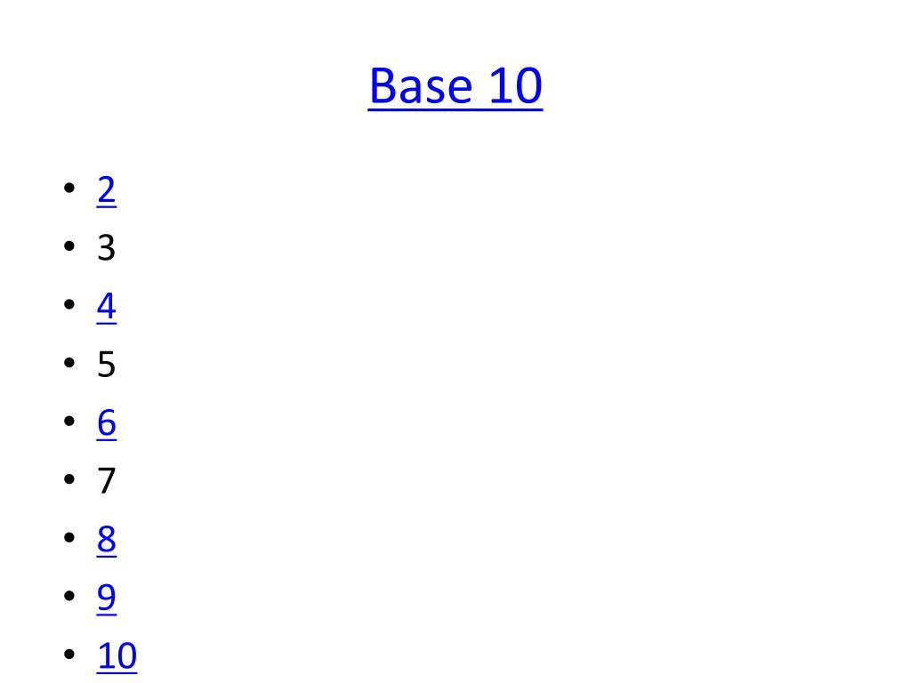 Base 10 • 2 • 3 • 4 • 5 • 6 • 7 • 8 • 9 • 10