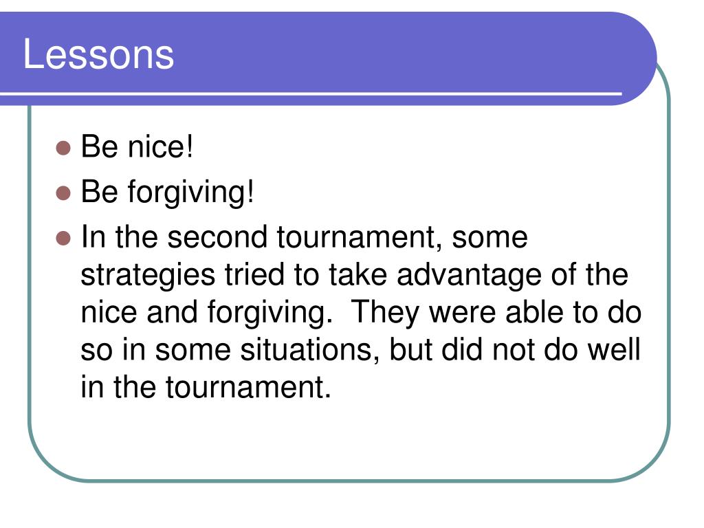 Lessons • Be nice! • Be forgiving! • In the second tournament, some strategies tried to take advantage of the nice and forgiving. They were able to do so in some situations, but did not do well in the tournament.