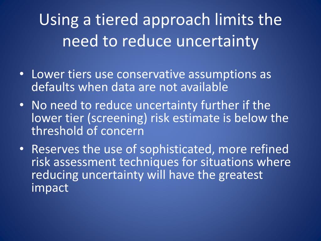 Using a tiered approach limits the need to reduce uncertainty • Lower tiers use conservative assumptions as defaults when data are not available • No need to reduce uncertainty further if the lower tier (screening) risk estimate is below the threshold of concern • Reserves the use of sophisticated, more refined risk assessment techniques for situations where reducing uncertainty will have the greatest impact