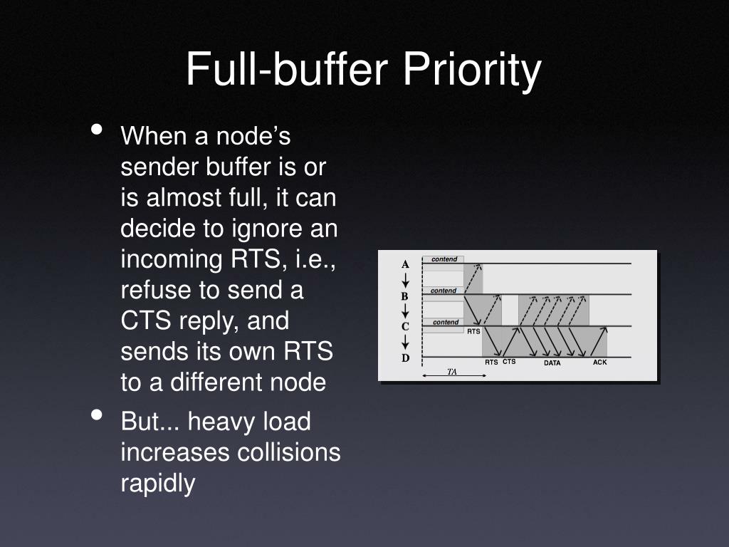 Full-buffer Priority • When a node’s sender buffer is or is almost full, it can decide to ignore an incoming RTS, i.e., refuse to send a CTS reply, and sends its own RTS to a different node • But... heavy load increases collisions rapidly