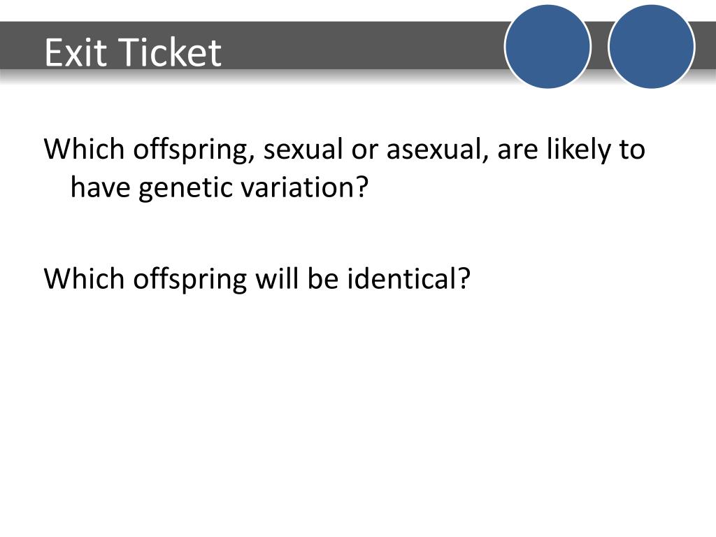 Exit Ticket Which offspring, sexual or asexual, are likely to have genetic variation? Which offspring will be identical?