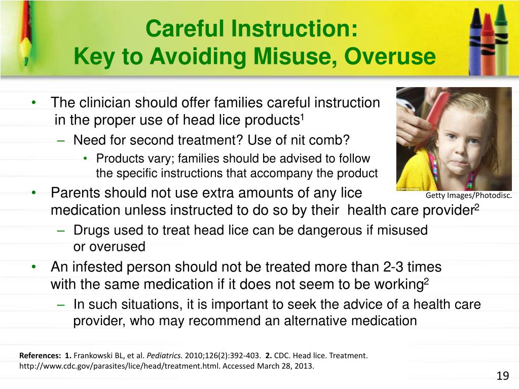 Careful Instruction: Key to Avoiding Misuse, Overuse • The clinician should offer families careful instruction in the proper use of head lice products1 • Need for second treatment? Use of nit comb? • Products vary; families should be advised to followthe specific instructions that accompany the product • Parents should not use extra amounts of any lice medication unless instructed to do so by their health care provider2 • Drugs used to treat head lice can be dangerous if misusedor overused • An infested person should not be treated more than 2-3 timeswith the same medication if it does not seem to be working2 • In such situations, it is important to seek the advice of a health care provider, who may recommend an alternative medication Getty Images/Photodisc. References: 1. Frankowski BL, et al. Pediatrics. 2010;126(2):392-403. 2. CDC. Head lice. Treatment. http://www.cdc.gov/parasites/lice/head/treatment.html. Accessed March 28, 2013. 19