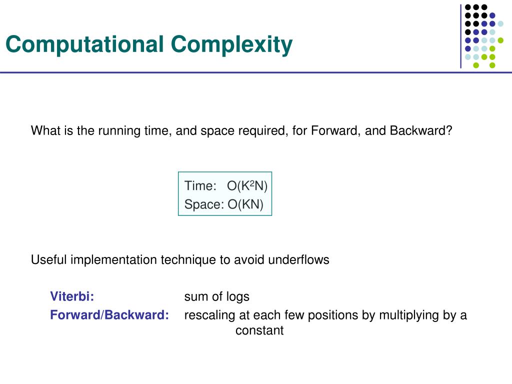 Computational Complexity What is the running time, and space required, for Forward, and Backward? Time: O(K2N) Space: O(KN) Useful implementation technique to avoid underflows Viterbi: sum of logs Forward/Backward: rescaling at each few positions by multiplying by a constant