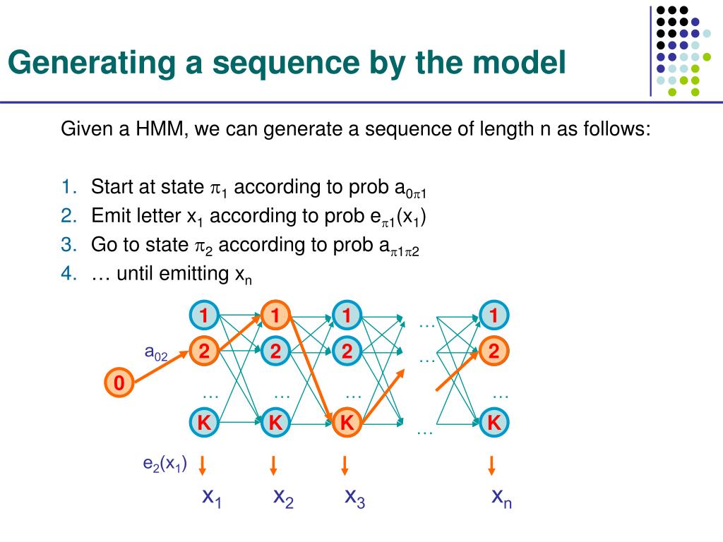 1 1 1 1 … 2 2 2 2 … … … … … K K K K … Generating a sequence by the model Given a HMM, we can generate a sequence of length n as follows: • Start at state 1 according to prob a01 • Emit letter x1 according to prob e1(x1) • Go to state 2 according to prob a12 • … until emitting xn 1 a02 2 2 0 K e2(x1) x1 x2 x3 xn