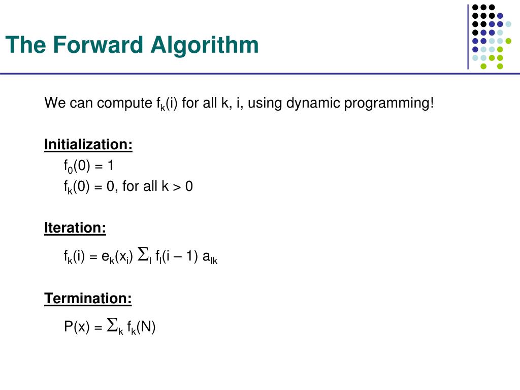 The Forward Algorithm We can compute fk(i) for all k, i, using dynamic programming! Initialization: f0(0) = 1 fk(0) = 0, for all k > 0 Iteration: fk(i) = ek(xi) l fl(i – 1) alk Termination: P(x) = k fk(N)