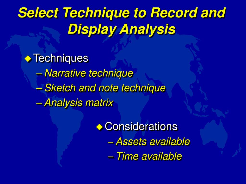 Select Technique to Record and Display Analysis • Techniques • Narrative technique • Sketch and note technique • Analysis matrix • Considerations • Assets available • Time available