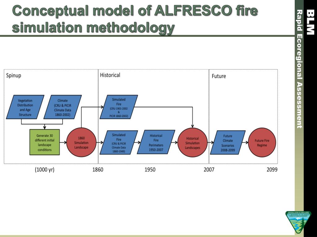 Conceptual model of downscaled climate products Monthly projected data, temp and precip, to 2100, for 3 emission scenarios Global Circulation Models (AR4) 5 highest –performing models Downscaling with PRISM 1971-2000 baseline, 771m resolution GCM selection Data selection Data processing 5-model composite, A2 and A1B scenarios, baseline plus 2020s, 2050s, 2060s (decadal averages) Selection of key variables pertinent to CEs Inputs to ALFRESCO, Cliomes model, and GIPL permafrost model; creation of freeze, thaw, and season length interpolations Data selection Climate Model See model schematics for full inputs Fire Model Permafrost Model Biome shift model