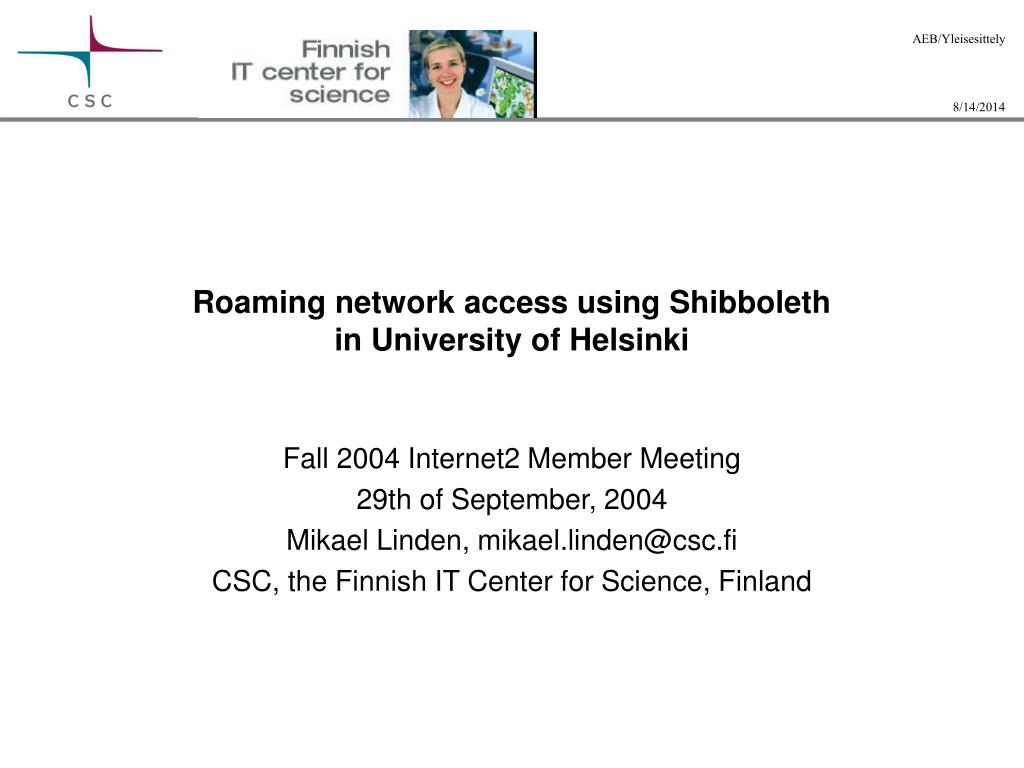AEB/Yleisesittely Roaming network access using Shibbolethin University of Helsinki Fall 2004 Internet2 Member Meeting 29th of September, 2004 Mikael Linden, mikael.linden@csc.fi CSC, the Finnish IT Center for Science, Finland
