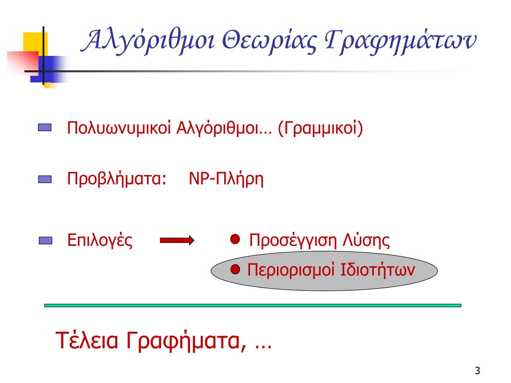 Αλγόριθμοι Θεωρίας Γραφημάτων Πολυωνυμικοί Αλγόριθμοι… (Γραμμικοί) Προβλήματα: NP-Πλήρη Επιλογές Προσέγγιση Λύσης Περιορισμοί Ιδιοτήτων Τέλεια Γραφήματα, …