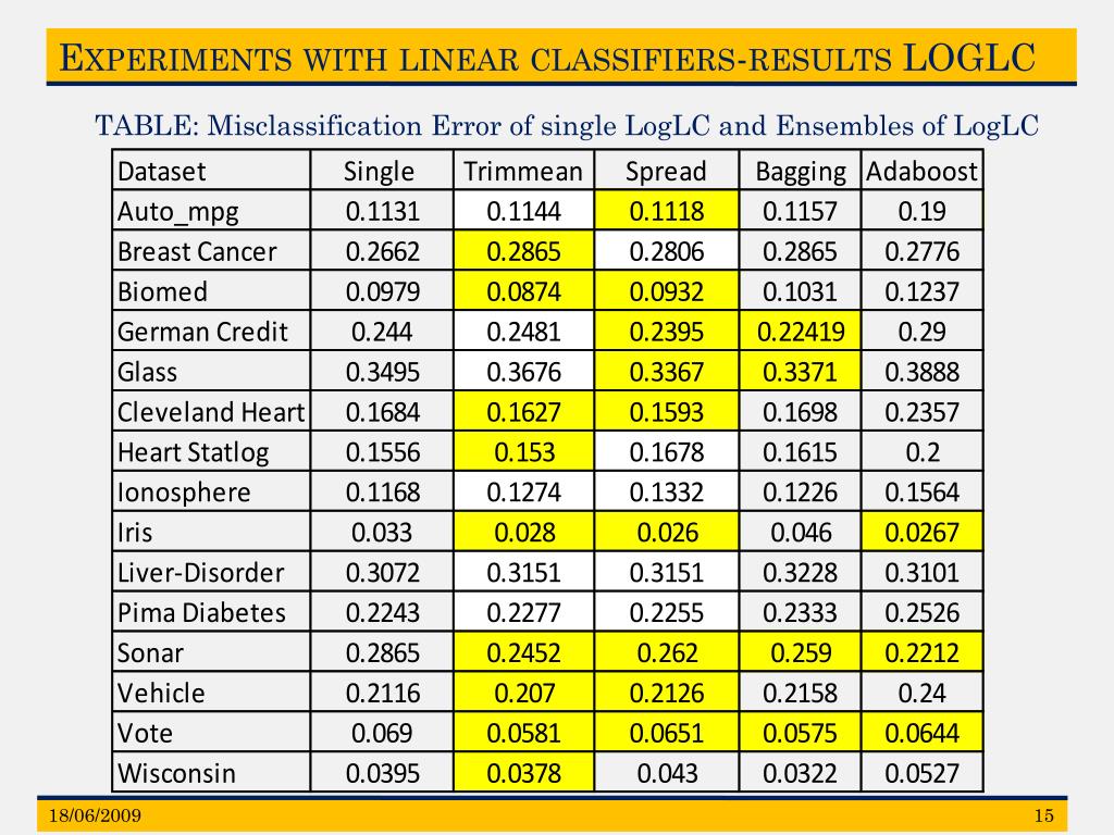 Experiments with linear classifiers-results LOGLC TABLE: Misclassification Error of single LogLC and Ensembles of LogLC 18/06/2009 15