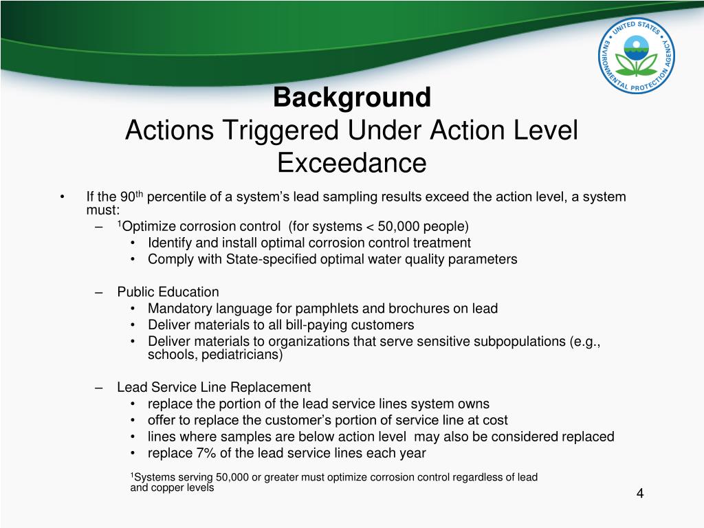 BackgroundActions Triggered Under Action Level Exceedance • If the 90th percentile of a system’s lead sampling results exceed the action level, a system must: • 1Optimize corrosion control (for systems < 50,000 people) • Identify and install optimal corrosion control treatment • Comply with State-specified optimal water quality parameters • Public Education • Mandatory language for pamphlets and brochures on lead • Deliver materials to all bill-paying customers • Deliver materials to organizations that serve sensitive subpopulations (e.g., schools, pediatricians) • Lead Service Line Replacement • replace the portion of the lead service lines system owns • offer to replace the customer’s portion of service line at cost • lines where samples are below action level may also be considered replaced • replace 7% of the lead service lines each year 1Systems serving 50,000 or greater must optimize corrosion control regardless of lead and copper levels