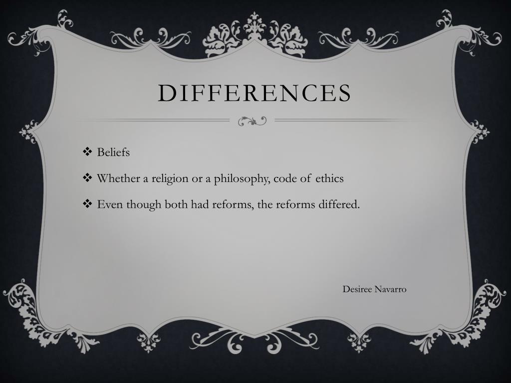 Differences • Beliefs • Whether a religion or a philosophy, code of ethics • Even though both had reforms, the reforms differed. Desiree Navarro