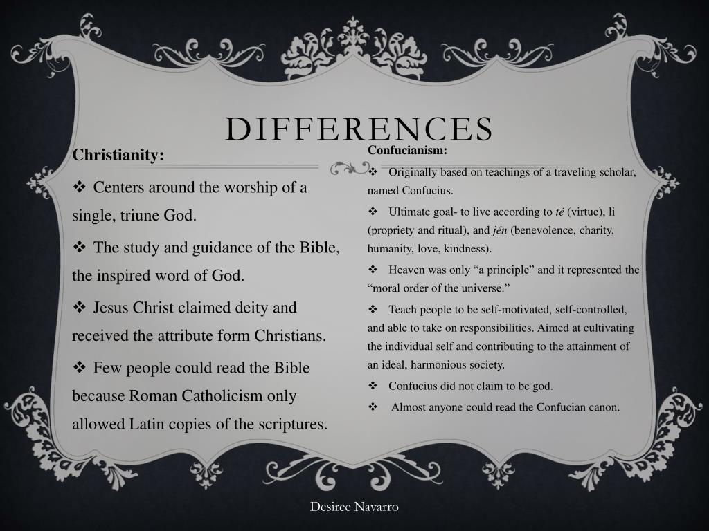 Differences Christianity: Centers around the worship of a single, triune God. The study and guidance of the Bible, the inspired word of God. Jesus Christ claimed deity and received the attribute form Christians. Few people could read the Bible because Roman Catholicism only allowed Latin copies of the scriptures. Confucianism: Originally based on teachings of a traveling scholar, named Confucius. Ultimate goal- to live according to té (virtue), li (propriety and ritual), and jén (benevolence, charity, humanity, love, kindness). Heaven was only “a principle” and it represented the “moral order of the universe.” Teach people to be self-motivated, self-controlled, and able to take on responsibilities. Aimed at cultivating the individual self and contributing to the attainment of an ideal, harmonious society. Confucius did not claim to be god. Almost anyone could read the Confucian canon. Desiree Navarro