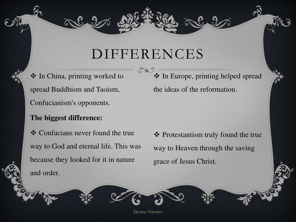 Differences In China, printing worked to spread Buddhism and Taoism, Confucianism's opponents. The biggest difference: Confucians never found the true way to God and eternal life. This was because they looked for it in nature and order. In Europe, printing helped spread the ideas of the reformation. Protestantism truly found the true way to Heaven through the saving grace of Jesus Christ. Desiree Navarro