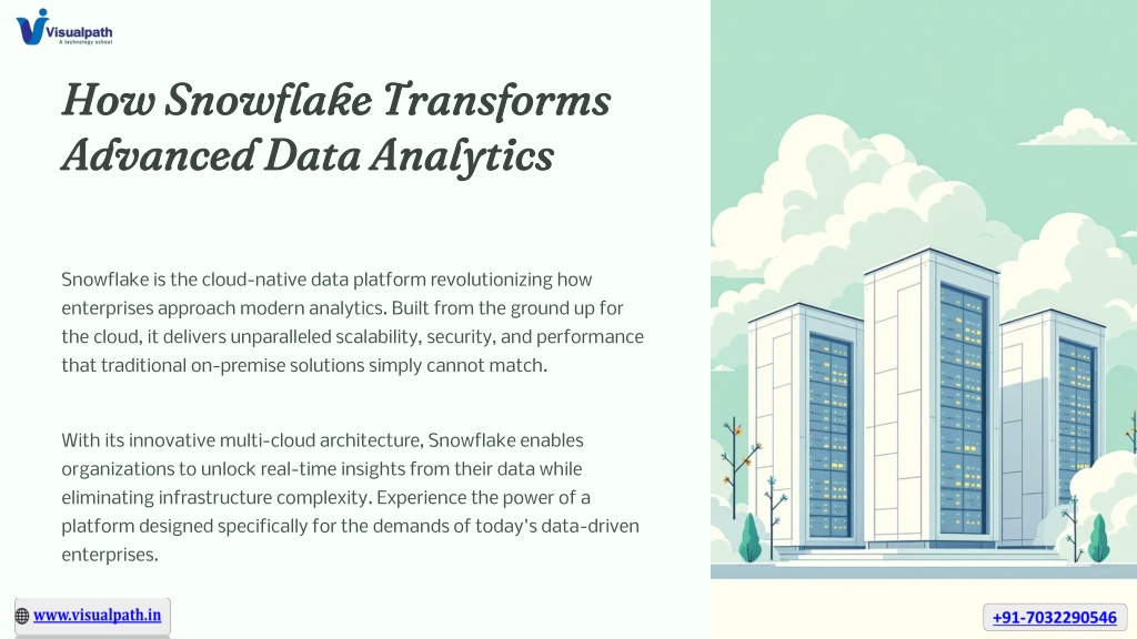 1. How Snowflake Transforms Advanced Data Analytics Snowflake is the cloud-native data platform revolutionizing how enterprises approach modern analytics. Built from the ground up for the cloud, it delivers unparalleled scalability, security, and performance that traditional on-premise solutions simply cannot match. With its innovative multi-cloud architecture, Snowflake enables organizations to unlock real-time insights from their data while eliminating infrastructure complexity. Experience the power of a platform designed specifically for the demands of today's data-driven enterprises.