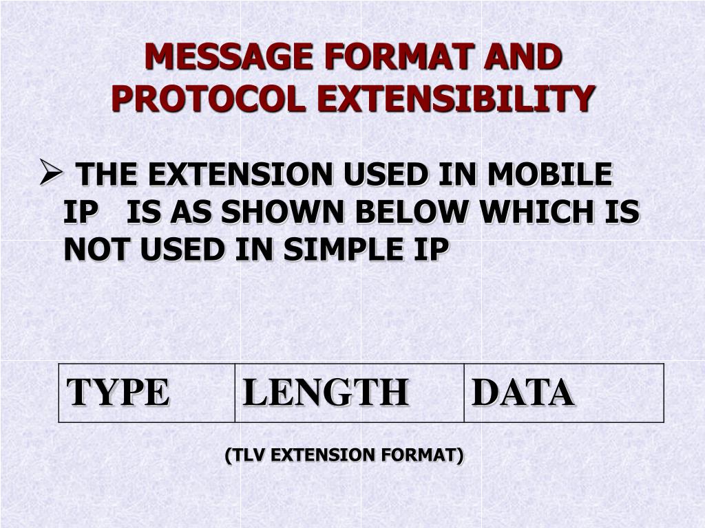 MESSAGE FORMAT AND PROTOCOL EXTENSIBILITY • THE EXTENSION USED IN MOBILE IP IS AS SHOWN BELOW WHICH IS NOT USED IN SIMPLE IP (TLV EXTENSION FORMAT)