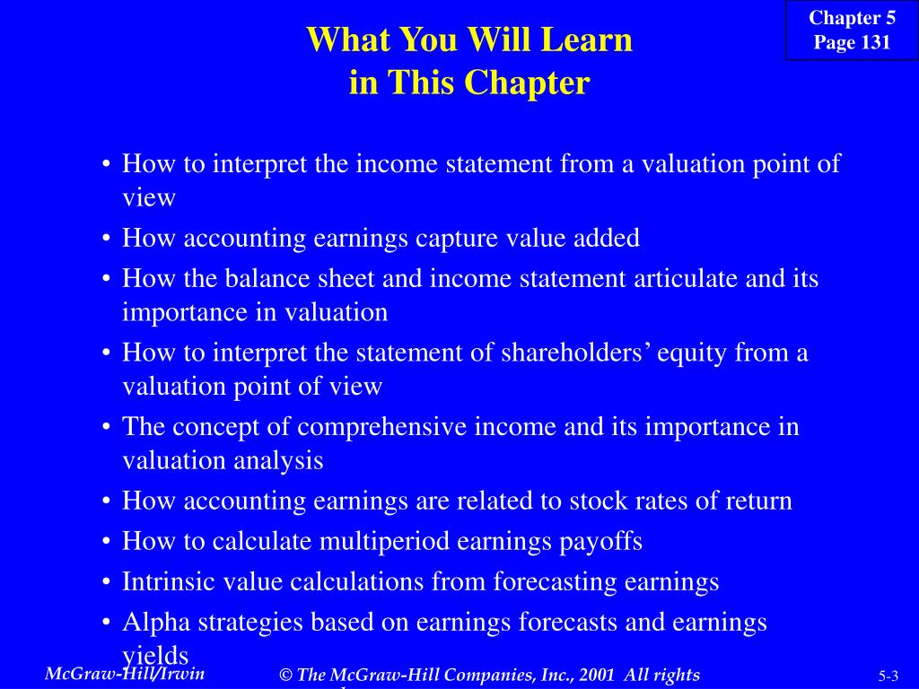 Chapter 5 Page 131 What You Will Learn in This Chapter • How to interpret the income statement from a valuation point of view • How accounting earnings capture value added • How the balance sheet and income statement articulate and its importance in valuation • How to interpret the statement of shareholders’ equity from a valuation point of view • The concept of comprehensive income and its importance in valuation analysis • How accounting earnings are related to stock rates of return • How to calculate multiperiod earnings payoffs • Intrinsic value calculations from forecasting earnings • Alpha strategies based on earnings forecasts and earnings yields