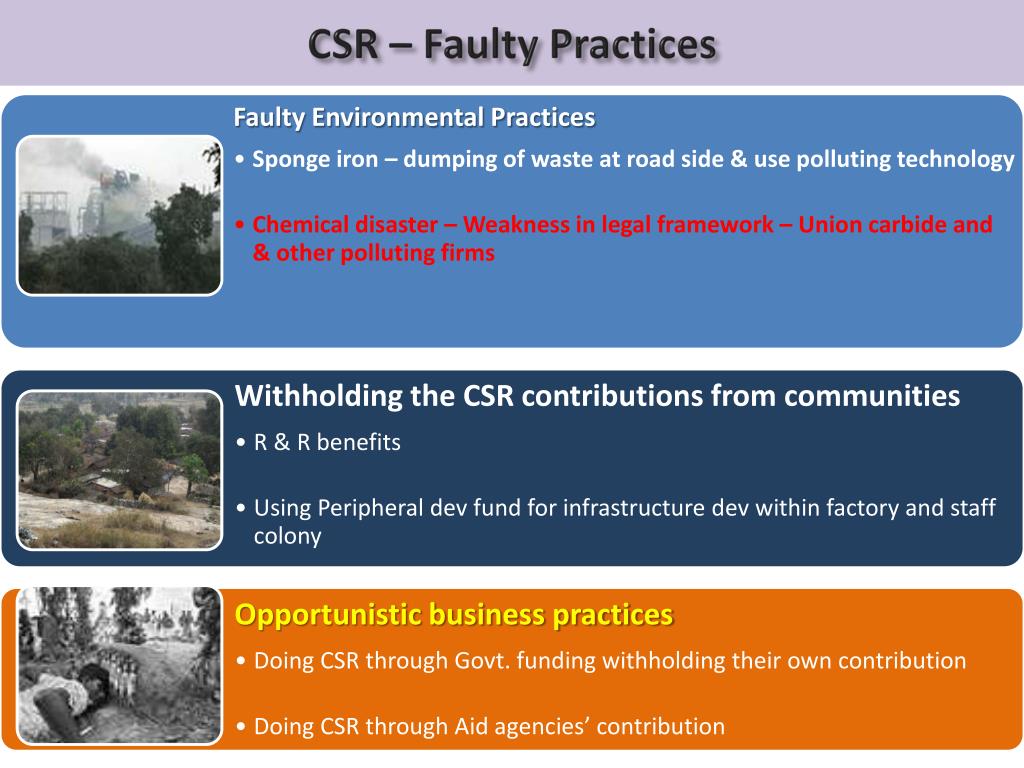 This article critically assesses the Indian government's industrial policy regarding peaceful cohabitation of industries and people, examines CSR best practices and faulty practices harming industrial credibility, analyzes CSR contributions to sustainable growth, and explores corporate governance principles for sustainable development through CSR. The study methodology involves desk and field reviews, analysis of CSR activities, governmental policy guidelines, and industrial case studies to evaluate CSR impact on social, environmental, and economic facets. The concept of CSR in the Indian context, governmental measures, and weaknesses in monitoring ESG are also discussed, along with a focus on CSR practices and industrial responses in India, including both best practices and faulty environmental practices observed in factories. The article highlights real-world examples such as the tragic events in Bhopal and the exploitative land acquisition practices affecting communities.