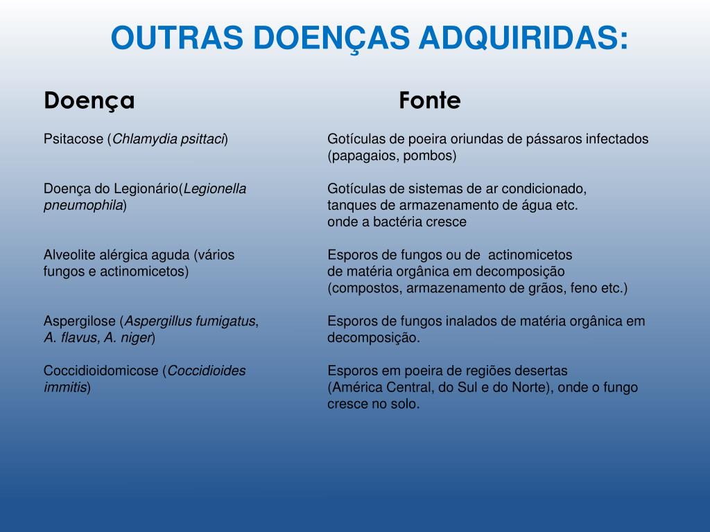 OUTRAS DOENÇAS ADQUIRIDAS: • Doença Fonte • Psitacose (Chlamydia psittaci) Gotículas de poeira oriundas de pássaros infectados • (papagaios, pombos) • Doença do Legionário(Legionella Gotículas de sistemas de ar condicionado, • pneumophila) tanques de armazenamento de água etc. • onde a bactéria cresce • Alveolite alérgica aguda (vários Esporos de fungos ou de actinomicetos • fungos e actinomicetos) de matéria orgânica em decomposição • (compostos, armazenamento de grãos, feno etc.) • Aspergilose (Aspergillus fumigatus, Esporos de fungos inalados de matéria orgânica em • A. flavus, A. niger) decomposição. • Coccidioidomicose (Coccidioides Esporos em poeira de regiões desertas • immitis) (América Central, do Sul e do Norte), onde o fungo • cresce no solo.