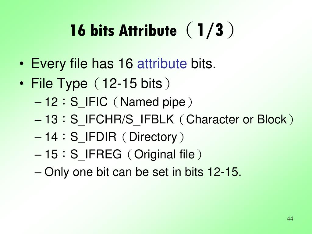 16 bits Attribute(1/3) • Every file has 16 attribute bits. • File Type(12-15 bits) • 12:S_IFIC(Named pipe) • 13:S_IFCHR/S_IFBLK(Character or Block) • 14:S_IFDIR(Directory) • 15:S_IFREG(Original file) • Only one bit can be set in bits 12-15.