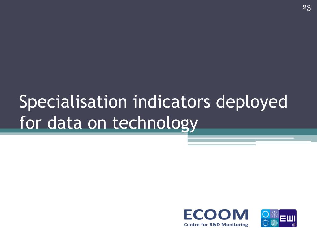 Measures of national and regional specialisation: • Relative specialization indicators are typically used: • RTAij = (Pij/SiPij)/(SjPji/SijPij) • with P the number of patents • with i = country-grouping variable and j = patent IPC-class grouping (technological domain or industrial sector) • value of 1 = benchmark group average • various mapping possibilities (RCA - RTA or RTA over different periods, …) exist