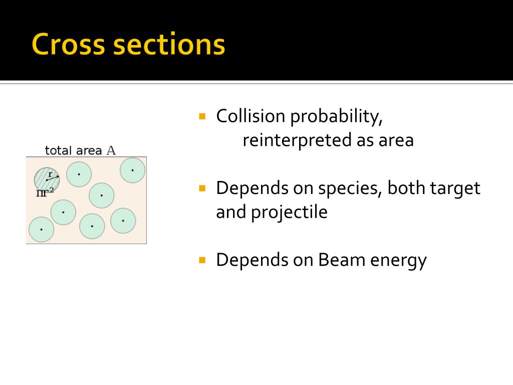 Cross sections • Collision probability, reinterpreted as area • Depends on species, both target and projectile • Depends on Beam energy