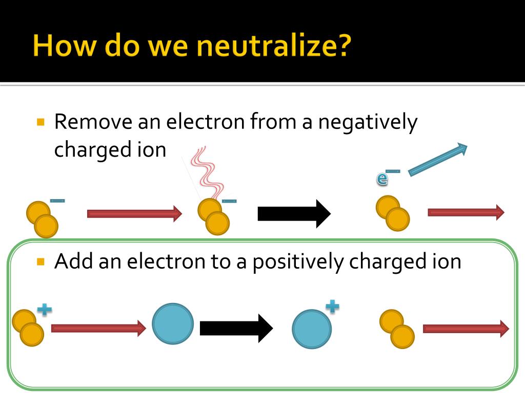 How do we neutralize? • Remove an electron from a negatively charged ion • Add an electron to a positively charged ion e