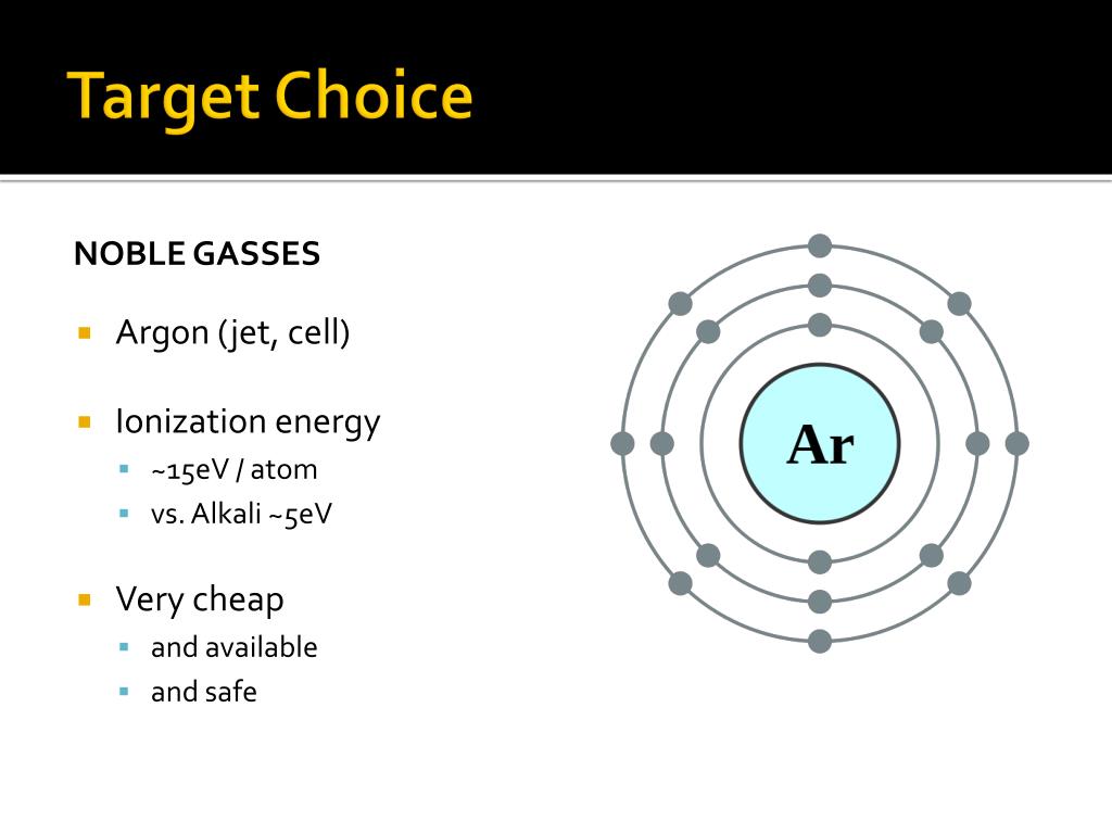 Target Choice Noble Gasses • Argon (jet, cell) • Ionization energy • ~15eV / atom • vs. Alkali ~5eV • Very cheap • and available • and safe