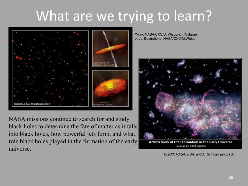 What are we trying to learn? X-ray: NASA/CXC/U. Wisconsin/A.Barger et al.; Illustrations: NASA/CXC/M.Weiss NASA missions continue to search for and study black holes to determine the fate of matter as it falls into black holes, how powerful jets form, and what role black holes played in the formation of the early universe. Credit:NASA, ESA, and A. Schaller (for STScI)